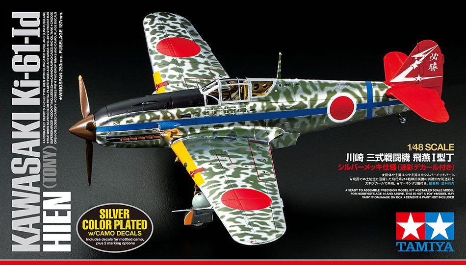 ★This is a 1/48 scale plastic model assembly kit. Length: 187mm, width: 250mm. ★Accurately depicts the Ki-61-Id type Hien form with elongated nose and slim fuselage. ★Features silver color metal plated fuselage and wings. ★Ha-40 V12 engine has depiction of supercharger. ★Cockpit includes 20mm cannon ammunition cases and oil tank. ★Choose between open and closed canopy. ★Comes with two drop tanks, camouflage decals, a seated pilot figure, and two marking options.