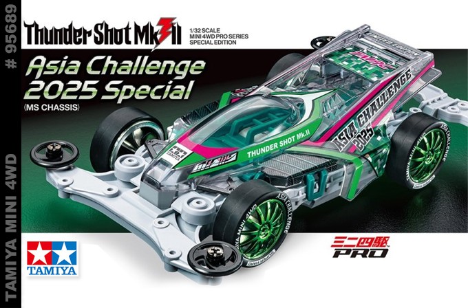 To commemorate the Tamiya Mini 4WD Asia Challenge 2025 (TMAC) which is planned in Taiwan in early summer 2025, this limited-edition release depicts our popular Item 18620 Thunder Shot Mk.II. It features a new color body (light smoke), MS chassis (light gray) with component parts (green), newly designed clear stickers and new packaging, which makes the car stand out!