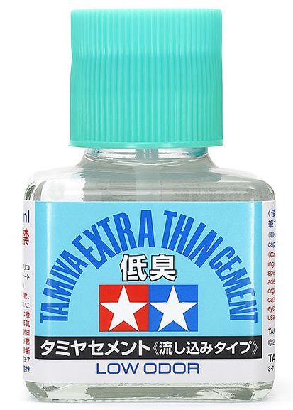 ★This version of our Extra Thin Cement is designed to emit less odor. ★Extra Thin Cement flows neatly into small gaps and crevasses when applied with the brush on the cap. ★It can be used on styrene and ABS plastic parts. ★Bond strength and drying times when used on styrene are equivalent to those of standard Tamiya Extra Thin Cement. ★Contents: 40ml.